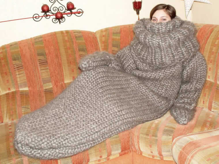 껴안을 생각이라면 보통 팔을 움직일 수 있어야 하죠. 이 뜨개질 선물은 기본적인 요구 사항을 무시한 것 같아요. 사람을 완전히 가두는 거대한 양모 누에고치 같아요. 마치 사람 크기의 애벌레처럼 보이네요. 물 한 잔도 꺼내 마실 수 없는데 어떻게 로맨틱한 분위기를 유지할 수 있겠어요!