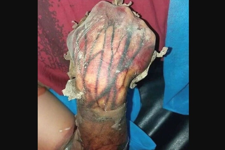 120볼트 이상의 교류 전류에 의한 화상입니다. 혈관이 타버린 것 같네요. 안쓰럽습니다.