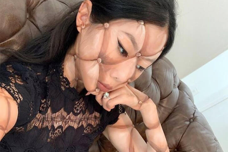 Ihr Outfit verstärkt die Illusion: Ein schwarzes Kleid umschließt den unteren Körper, während durch Netzpartien “freie” Haut sichtbar wird, die aber durch feine Linien ans Sofa anknüpft. Die resultierende Ambivalenz – Körper als Möbel, Möbel als Körper – spielt mit der menschlichen Neigung, sich in seine Umgebung zu verlieren. Ein subtiles Statement über Identität und Anpassung, verpackt in einer optischen Täuschung, die den Blick versöhnt und stört zugleich.