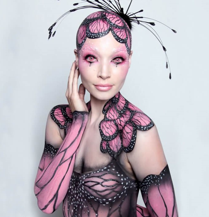 Beeindruckend ist, wie diese Künstlerin ihre Körperbemalung zu einer lebendigen Schmetterlingsgestalt verwebt: Mit einer Kopfbedeckung, die den Kopf verhillt, und kunstvollen Antennen vervollständigt sie das Insektensymbol. Ein Detailwermerkung: In der Natur gibt es keine rein rosa Schmetterlinge – das Farbspektrum liegt meist im Blauen, Purpurn oder Grünen, wobei manche Arten durch Lichtinterferenz einen rosafarbenen Glanz aufweisen können. Oft wird die Elefantenmotte (Saturniidae) mit ihrem sanften Rosa verwechselt, die aber keine echte Schmetterlingsart ist.