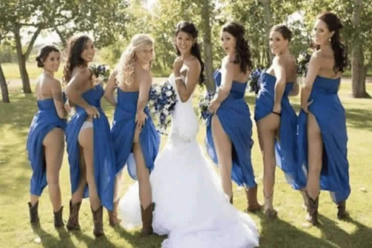Im krassen Gegensatz zur lässigen Herangehensweise des vorherigen Bräutigams entschieden sich die Brautjungfern hier für Eleganz. Es scheint jedoch, als hätte das warme Wetter eine einzigartige Lösung zur Abkühlung hervorgerufen, was darauf hindeutet, dass die Braut diesem Trend ebenfalls folgen könnte. Wird sie mit einem verspielten Anheben ihres Schleiers etwas mehr enthüllen?