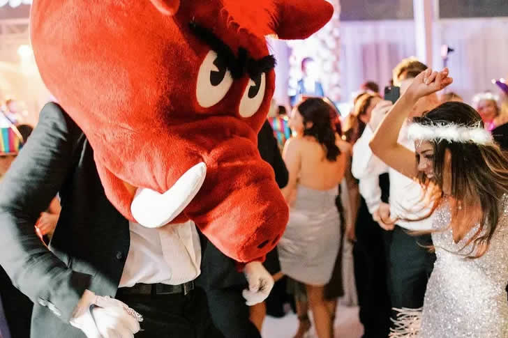 In diesem Fall hat der Bräutigam sich voll und ganz eingebracht, indem er mit seiner Braut auf der Tanzfläche stand und dabei einen Maskottchen-Kopf des Arkansas Razorback trug. Dieser unerwartete Schachzug sorgte für Lachen, Jubel und einen unvergesslichen Ausbruch von Schulgeist auf der Hochzeitsfeier.