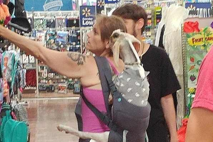 Die Ziege sieht aus, als würde sie dieser Frau ins Ohr flüstern, was auf ihrer Einkaufsliste vergessen wurde. Selbst wenn die Ziege ihr beim Einkaufen hilft, sollte sie vielleicht eine Leine verwenden statt eines BabyBjörn.