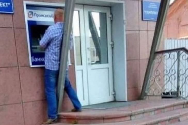 The result is a bizarre balancing act that feels like a scene from a silent comedy sketch. Despite the uncomfortable pose, the man seems completely focused on his transaction, as if this is just another day in the life. His calm demeanor paired with such a physically awkward stance captures the humor of adapting to public spaces not built with practicality in mind. It’s a visual reminder that when function fails, form takes over — often hilariously.
