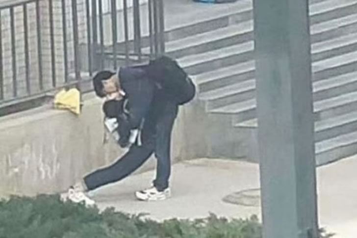 This photo captures a moment that’s equal parts confusing and adorable. At first glance, it seems like someone dropped something important—or maybe a yoga class just broke out unexpectedly on the sidewalk. In reality, the person in the image appears to be bending over for an intensely heartfelt embrace, using one leg stretched dramatically behind to support the weight of the gesture. It’s a full-body commitment to a hug, worthy of an Olympic-level warm-up.