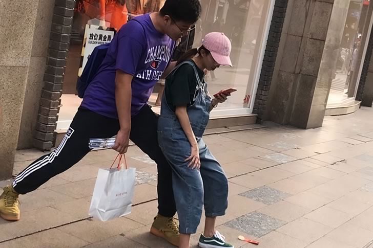 Public spaces often bring out the most unexpected yet heartwarming moments, and this photo is a perfect example. A man, arms full of shopping bags, strikes an exaggerated wide-legged pose behind a woman who appears to be pregnant, standing calmly and focused on her phone. His outstretched stance seems almost theatrical—yet there’s a tenderness to it, as if he’s forming a human shield to ensure she has space and balance. It’s a scene that’s as amusing as it is oddly sweet.