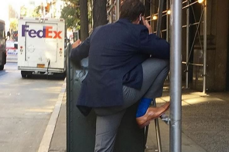 On a bustling city sidewalk, this sharply dressed professional decided that simply standing wasn’t going to cut it for his phone call. With one leg propped impossibly high against a utility box and his other arm resting like a seasoned climber, he appears to be striking a pose somewhere between a yoga stretch and a power stance. The bright blue socks and polished shoes only add to the unintentional theatrical flair of his street-side performance.