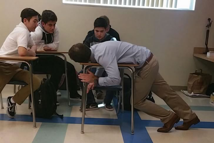 This bold move suggests either an intense passion for education or a complete disregard for ergonomic safety. Regardless, it’s clearly working—the students appear captivated, either by the lesson or the sheer physics-defying spectacle before them. It’s a hilarious reminder that sometimes, making a connection means literally meeting your audience halfway—horizontal desks and all.