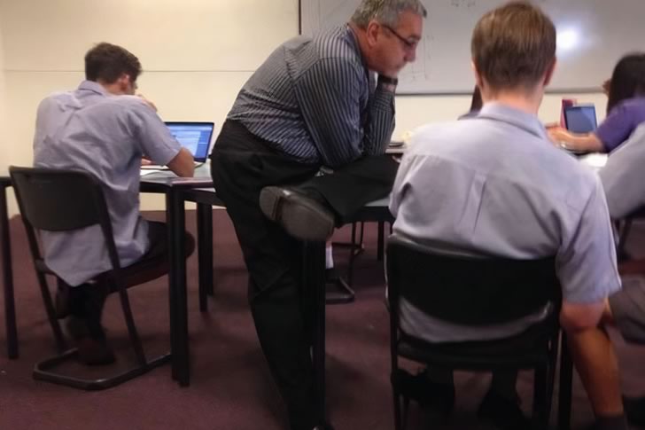 What makes the scene even funnier is how none of the students react. They’re all deeply immersed in their work, as if this odd pose is just a normal part of their daily routine. Maybe it’s a method of instruction—or maybe it’s just comfort. Either way, it’s a moment that blends serious academic focus with the casual confidence of someone who clearly does things their own way.