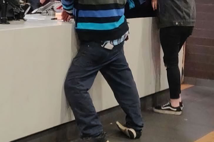 There’s waiting in line, and then there’s declaring war on gravity while doing it. This individual, spotted at a fast-food counter, appears to have planted himself in the most dramatic stance possible, legs wide apart like he’s bracing for an incoming tidal wave of french fries. His posture says one thing: he came for a burger, and he’s prepared to defend his place in line at all costs.