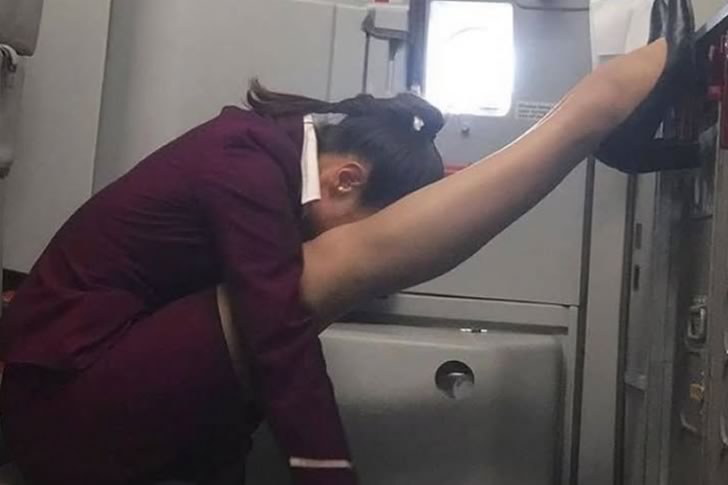 This photo captures a moment of unexpected agility in one of the least likely places: an airplane galley. A flight attendant, dressed immaculately in uniform, has struck a pose that would make a yoga instructor nod in approval. With one leg stretched vertically against the wall and her head resting between her knees, she demonstrates a level of flexibility rarely associated with airline service. It’s unclear whether this is part of a stretching routine or a unique stress relief technique, but either way, it turns the aisle into a runway for acrobatic poise.