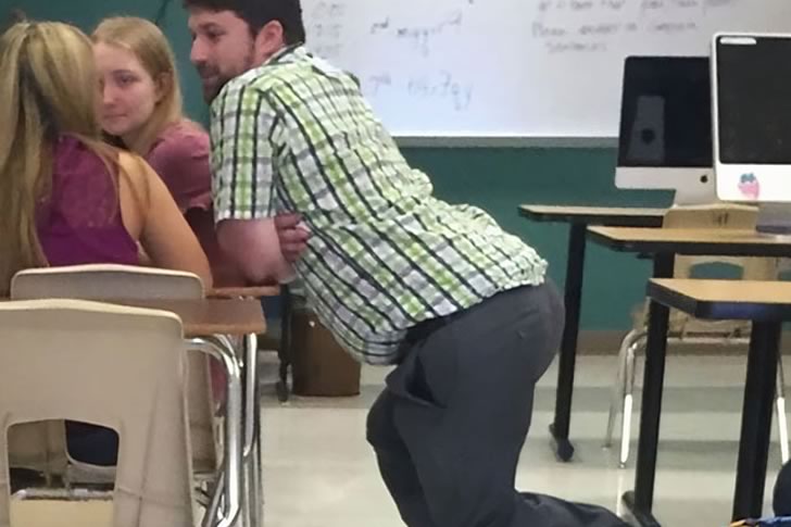 In what appears to be a classroom setting, this man has mastered the art of unconventional posture. Instead of simply pulling up a chair or kneeling normally, he’s opted for a bent-leg, hip-thrusted lean that looks more like a dance move mid-performance. It’s the kind of position that defies ergonomic advice and gravity at the same time, leaving onlookers wondering how it’s even comfortable.