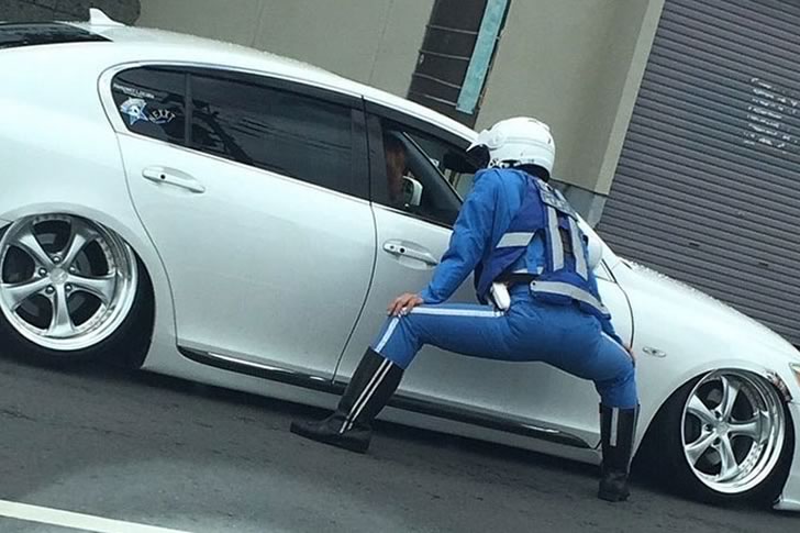 Caught in the middle of what appears to be a routine traffic stop, this officer has assumed a stance that blends intimidation with athletic prowess. With knees bent and back straight, he’s taken up a wide-legged squat to speak to the driver at eye level. The position is oddly theatrical, as if he’s about to break into a dance routine or challenge the car to a duel. The intensity of his posture is only rivaled by the aerodynamic precision of the car in front of him.
