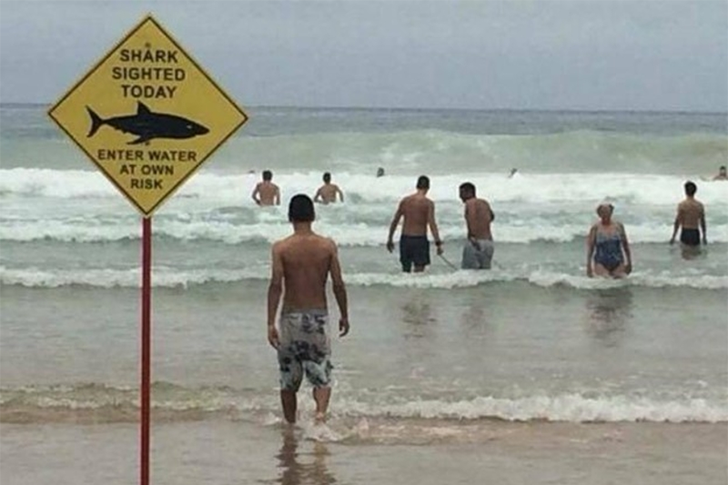 Dies ist kein Szenenausschnitt aus dem Film “Der weiße Hai”, sondern ein echtes Foto! Obwohl das Schild vor den Haien warnt, konnten viele Strandbesucher es nicht lassen, sich dem Wasser zu nähern.