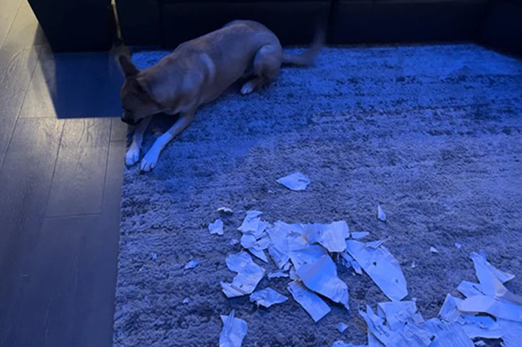 Si vede un cane birichino circondato da carte tritate, con i resti sparsi su tutto il tappeto. Il cane appare un po’ colpevole ma anche indifferente al disordine che ha creato. L’ambiente scuro e accogliente del soggiorno con un divano in pelle aggiunge un contrasto tra l’innocenza del cane e la scena caotica. L’illuminazione blu conferisce un tono freddo all’immagine.
