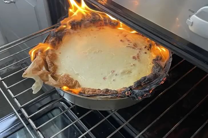 This fiery kitchen disaster shows exactly what happens when good intentions meet poor execution. The baker likely just wanted to make a lovely quiche or pie, but forgot one key detail—the parchment paper. It’s overflowing and clearly too close to the heating elements, turning a simple meal into a literal fire hazard. One second you’re prepping dinner, and the next, you’re calling for an extinguisher.