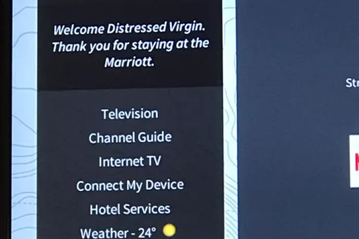 Sometimes automated systems fail in the most awkward ways, and this hotel screen is a prime example. Instead of greeting the guest by name or something neutral, the system combined airline data with a guest status in the most unfortunate way imaginable. “Distressed Virgin” is likely a mashup of “Distressed Passenger” and “Virgin Atlantic,” but out of context, it’s hilariously inappropriate—and definitely not the kind of message you’d want flashing across your hotel room TV.