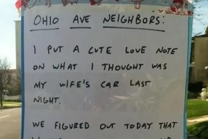 A well-meaning husband wanted to surprise his wife with a heartfelt love note, but in a sleepy haze, he placed it on the wrong car. By the time the error was discovered, the mysterious note had already confused a neighbor. Hoping to clear the air, the man posted a second message on a pole for all of Ohio Ave to see, clarifying he was not in love with anyone else—just tired and very much embarrassed.