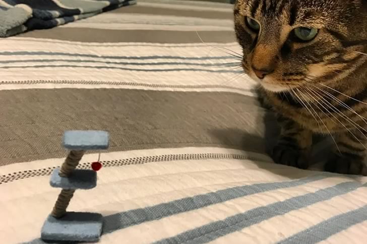 What makes this moment even more hilarious is the scale mismatch. The bed, the blanket stripes, and the looming cat all highlight just how absurdly tiny the toy is. Instead of satisfying the animal’s need for scratching and climbing, the post has become a monument to miscalculation. Whether it was a misread product description or deceptive advertising, this is a mistake that’s both unfortunate and unforgettable—especially for the unimpressed cat who was expecting a playground and got a paperweight.