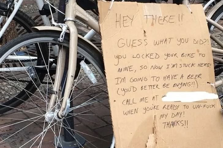 Imagine walking out to retrieve your bike, only to discover it has been held hostage by someone else’s careless lock job. That’s exactly what happened here. A stranger unknowingly locked their bike to another rider’s, essentially chaining both together in an unintentional act of urban imprisonment. The stranded cyclist’s response? A large, sarcastic cardboard note, humorously venting frustration and demanding a beer as compensation for the inconvenience.
