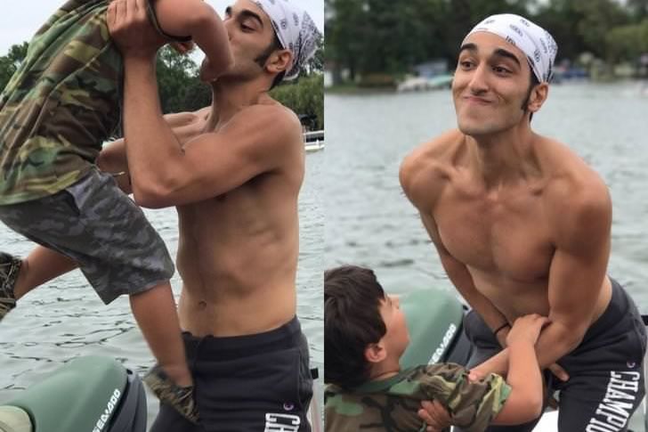 This hilariously timed pair of photos captures the exact moment when a playful lift turned into an accidental bite. The shirtless man, mid-laugh and flex, was clearly trying to show off some friendly strength by picking up a young boy—perhaps a younger sibling or cousin. What he didn’t expect was that the boy’s defense mechanism would be to latch onto his arm like a determined piranha. The expression on the man’s face says it all: a mix of shock, disbelief, and that special kind of regret you only feel when your bicep becomes a snack.