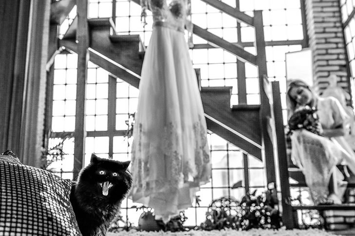 While the bride remained focused on her flowers, the cat seemed to enjoy the spotlight, giving the photo a playful twist. The result was a picture full of personality and coincidence—where elegance met feline mischief.