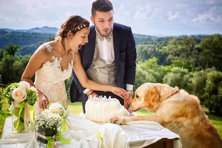 Just as the couple prepared for a beautiful photo beside their wedding cake—”Ready, set, smile!”—a Labrador suddenly leaped into the scene. Driven by the irresistible scent of frosting, the dog didn’t hesitate to go straight for the cake, clearly thinking it was there for him.