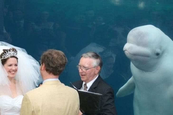 As the couple stands before the priest exchanging vows, a surprising guest looks on from behind the glass—a beluga whale. It floats gently in the background, creating a surreal yet touching moment.