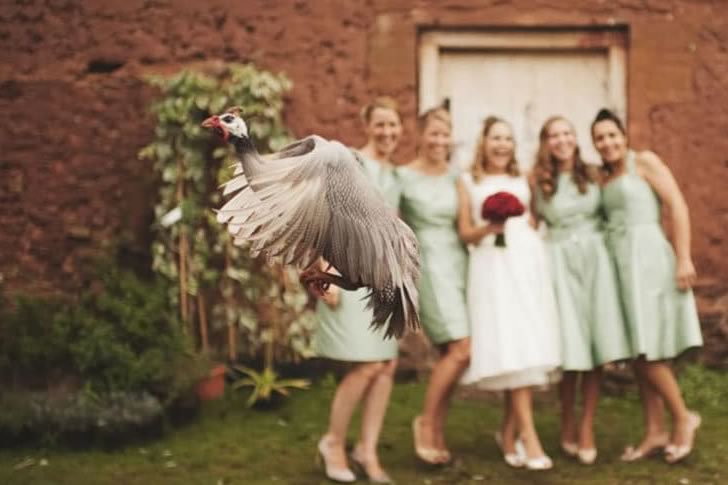 Just as the bride and bridesmaids are ready for their shot, a guineafowl flies straight across the frame. Its wings blur through the air at the exact moment the camera clicks, creating a once-in-a-lifetime image.