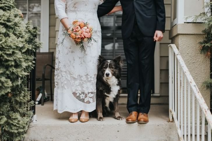 On the steps of a house framed by greenery, a bride and groom stand together, the bride holding a colorful bouquet. Between them sits a dog with a floral collar, its calm presence stealing the focus from their stylish outfits. The homey porch setting adds a welcoming vibe, but the dog becomes the center of attention.
