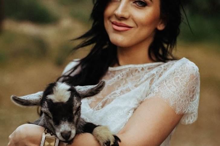 In a field with soft grass and trees, a bride holds a small goat, her lace dress and gray skirt complementing the rustic setting. The goat’s curious face and tiny hooves steal the spotlight, overshadowing the bride’s elegant look. The natural surroundings enhance the scene, but the goat takes center stage.