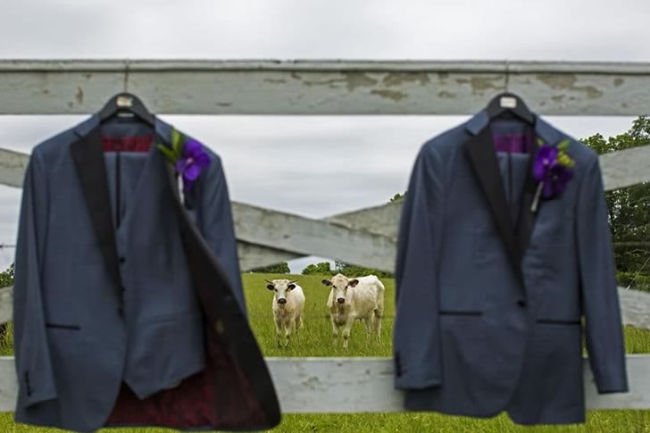 Just as the groomsmen were getting ready to show off their tuxedos, a herd of cows wandered casually into the scene. They seemed completely at home, standing around as if they owned the place.
