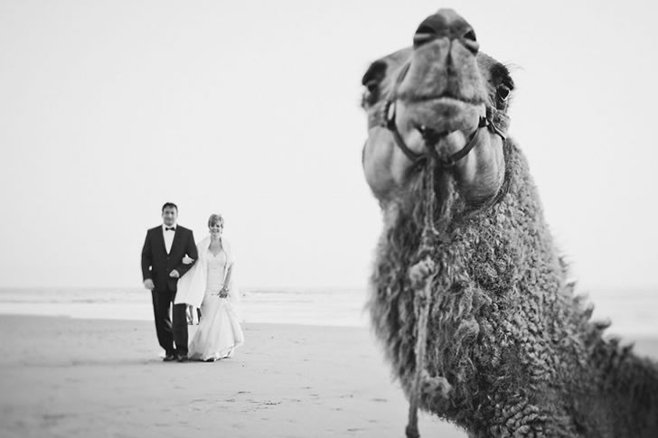 In the middle of a vast desert, the bride and groom can be seen in the distance, posing for their dream photo. But closer to the camera, a camel proudly stands front and center, seemingly taking credit for getting the couple there.