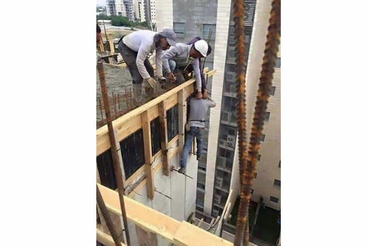Their motto? ‘Safety second, lunchtime theater first.’ PS: That guy peering over the edge isn’t checking progress—he’s calculating how many elevators he’ll skip tomorrow.