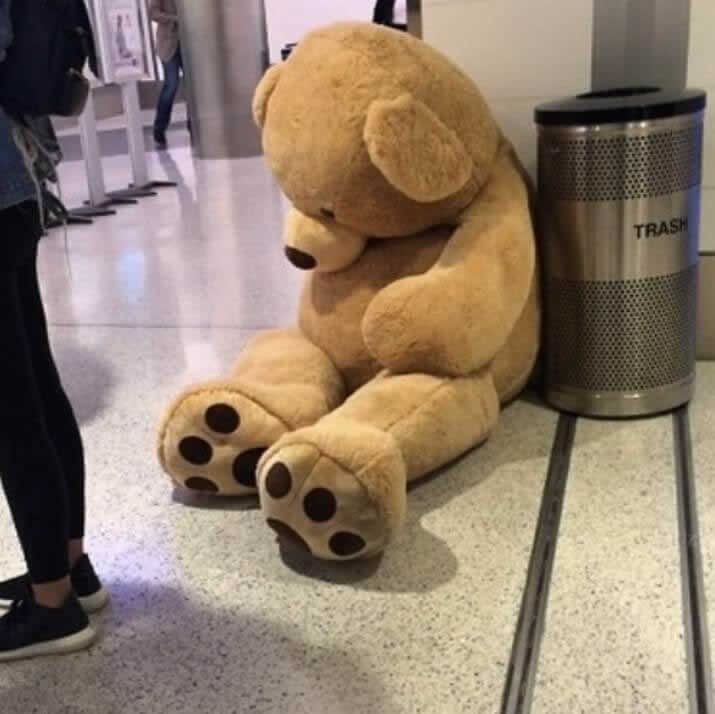 At LAX, a massive teddy bear was found sitting alone on the terminal floor. The toy had been abandoned after its owner was told it was too large to fit in the cabin as a carry-on.