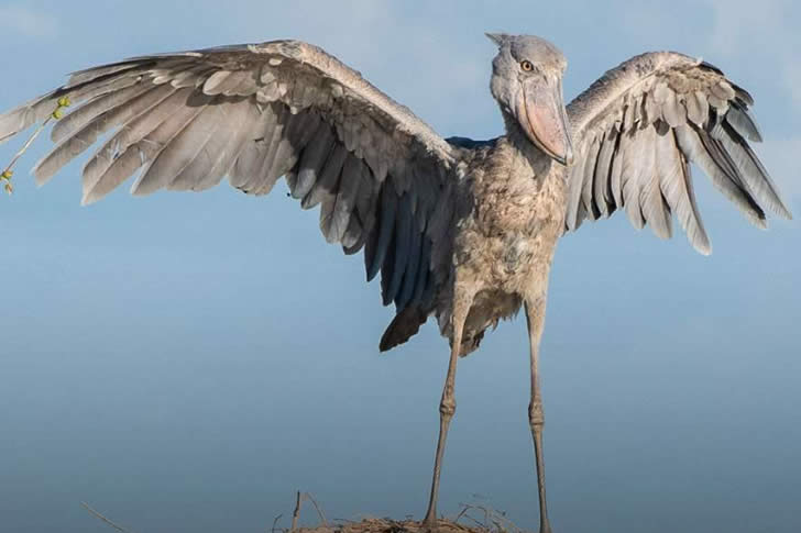 The shoebill is a massive prehistoric-looking stork standing up to 5 feet tall, with a huge, clog-shaped bill that gives it a permanent stern expression. It stalks the papyrus swamps of East Africa, moving slowly on long legs.