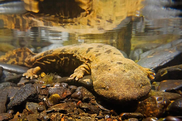 The hellbender is a giant aquatic salamander with wrinkled, slimy brown skin, a flat head, and tiny eyes. It can grow over 2 feet long and lives under rocks in clear, fast-flowing rivers of eastern North America.