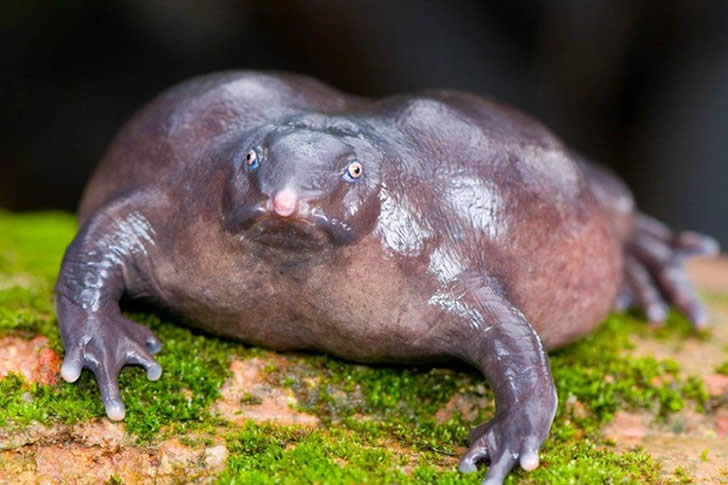 The purple frog is a bloated, purple-gray burrowing amphibian with a tiny head and stubby limbs. It spends almost its entire life underground in the Western Ghats of India, emerging only for a few days each year to breed.