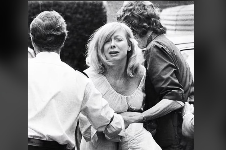 L’ancienne reine de beauté, la lauréate de Miss Wyoming Joyce McKinney, arrêtée par la police après avoir enlevé le missionnaire mormon Kirk Anderson de son église, le forçant à être son esclave sexuel pendant 3 jours, en 1977.
