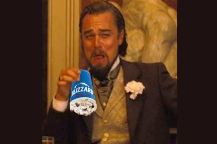這是一張合成迷因圖,將李奧納多·狄卡皮歐在電影《決殺令》中的酒杯換成了Dairy Queen的暴風雪冰淇淋杯。這是一個關於在最戲劇性的場景中,仍舊沉溺於「罪惡的快樂」的玩笑。這張迷因圖常用來慶祝一些小勝利,例如完成一個工作專案,用你最喜歡的點心來舉杯慶祝——根本不需要什麼高腳杯啦!