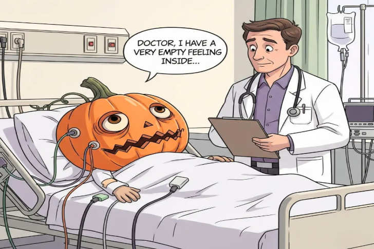 This Halloween-themed meme uses a classic pun: the pumpkin-headed patient says, “I have a very empty feeling inside…” which works on two levels—pumpkins are hollow, and it’s a relatable joke about feeling emotionally empty. The doctor’s confused expression adds to the humor, making it perfect for spooky season or when you just need to share a dad joke with your friends.
