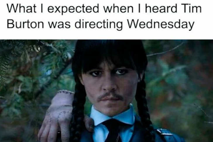 Questo meme scherza sulle aspettative dei fan quando hanno saputo che Tim Burton avrebbe diretto Wednesday: una versione cupa e gotica con Johnny Depp travestito da Mercoledì Addams. Gioca sullo stile distintivo di Burton di scritturare Depp in ruoli stravaganti, e l’assurdità dell’immagine cattura perfettamente l’amore di internet per le previsioni esagerate.