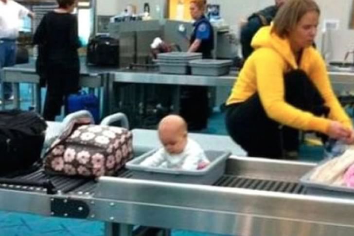 Airports are known for their strict security protocols, but this photo hilariously captures a moment that pushes the absurdity to new heights. A baby, calmly sitting in a plastic bin on the security conveyor belt, looks ready to be scanned like another piece of luggage. While it’s highly unlikely this was intentional or standard procedure, the image perfectly embodies the chaos and confusion that often comes with getting through airport security with kids in tow.