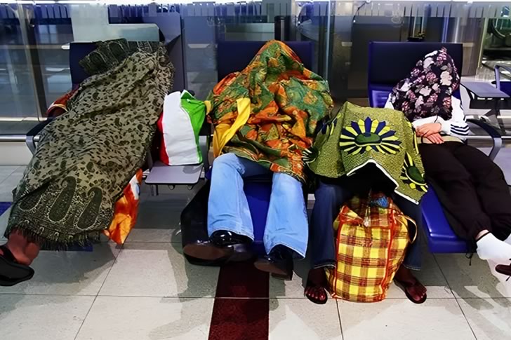 There’s fashion, and then there’s airport sleep fashion taken to an entirely new level. In this photo, a group of travelers managed to coordinate the most vibrant, colorful nap session imaginable. Each person is wrapped in a boldly patterned blanket that not only shields them from the harsh terminal lighting but also turns them into walking art installations — if walking were at all involved.