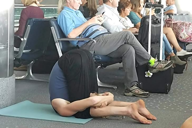 What makes this moment even more amusing is the stark contrast between the focused yoga practitioner and the oblivious crowd of passengers around them. No one bats an eye, as if it’s completely normal to see someone folded in half like a suitcase just before boarding. It’s a hilarious yet oddly inspiring reminder that when life delays your flight, you might as well stretch it out—literally.