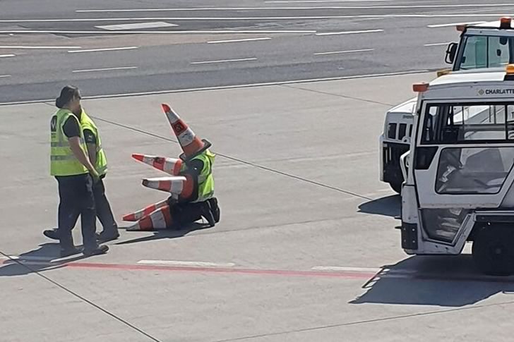 At Prague Airport, work on the tarmac isn’t always all seriousness and schedules—sometimes, it’s the perfect stage for a little improvised comedy. In this unexpected moment, one worker decided to become a human traffic cone, balancing several orange cones on his arms, legs, and head, much to the amusement of a colleague passing by. While airports are known for strict regulations and streamlined operations, this brief comedic break shows there’s always room for a bit of levity.