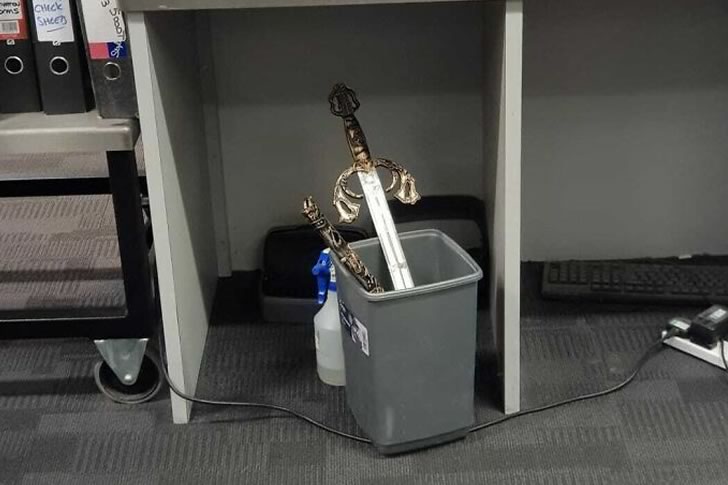 Security checkpoints are places of routine—empty your pockets, remove your belt, and occasionally… surrender your medieval weaponry? That was clearly the case at Newcastle International Airport, where an ornate sword found its final resting place: the bottom of a gray bin beneath the security desk. The decorative hilt and glinting blade, now tucked between a cleaning spray bottle and some discarded items, make for a surreal scene that feels more fantasy RPG than standard airport procedure.