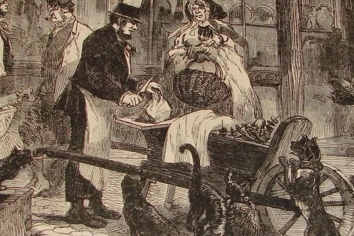 In 19th-century London, cat meat men sold cheap scraps and offal, mainly intended for feeding pet cats. Carrying buckets through the streets, they shouted to advertise their smelly wares, often struggling against the urban filth and stench themselves.