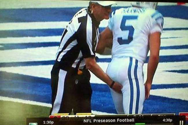 What exactly did the photographer capture here? Whatever the case, this referee’s hands-on approach with the player doesn’t look like standard procedure. Maybe he was adjusting the uniform – but such inspections typically happen pre-game, not mid-play in a packed stadium.