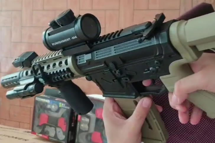 This water gun, modeled after the violent comic character The Punisher, looked like a realistic assault rifle with skull logos and firing sounds. It sprayed water with enough force to sting, raising concerns about encouraging violent play.